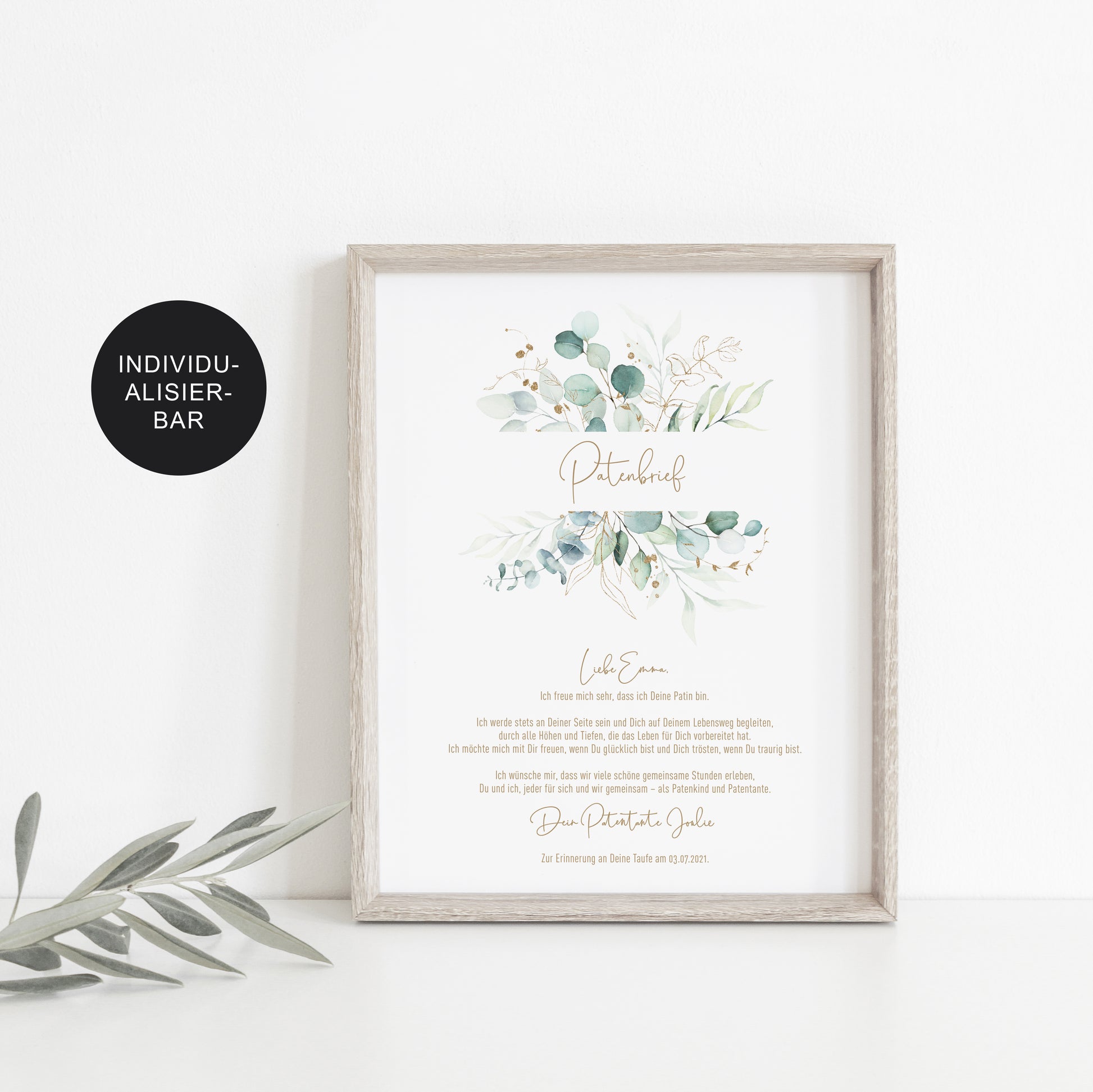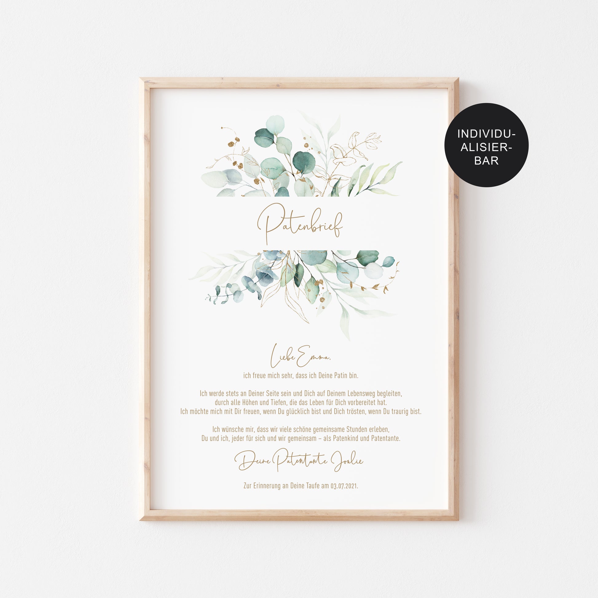 Zarte und schlichte Eukalyptusblätter zieren diesen Patenbrief. Du kannst den Taufbrief deinem zukünftigen Patenkind schenken. dabei ist es egal ob du die Patentante oder der Patenonkel bist. Der Text wird dementsprechend angepasst. Du kannst den Text auch komplett ändern oder das Taufdatum weg lassen... alles kein Problem.